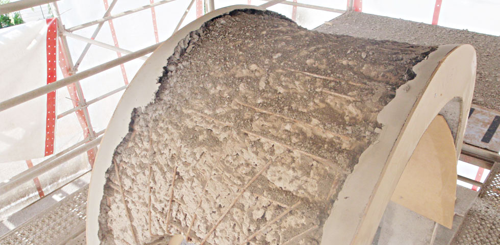 Die Planung sah den Abtrag der Farb- und Feinmörtelschichten mittels Höchstdruck-Wasserstrahl-Verfahren bei ca. 2000 – 2200 bar vor. Bereits oberhalb 1200 bar lösten sich großflächige Reparaturflächen vom Betonkern ab. Der bereits durch das Hellgrau des Betons vermittelte Eindruck wurde durch die Beprobung mittels Schmidt’schen Rückprallhammers bestätigt. Den Werten entsprechend wurde der Beton der Festigkeitsklassen C 16/20 bis C 20/25 zugeordnet. Die Feststellungen der Karbonatisierungstiefen und der Korrosionsschäden an der freigelegten Bewehrung dienten zur Festlegung der Abtragstärken des Betons. Dies führte relativ schnell zur Erkenntnis, dass die Bausubstanz des Sprungturmes sich hart an der Grenze der Instandsetzungsfähigkeit bewegte. Auf Grundlage dieser Erkenntnis fiel dann die Entscheidung, den Sprungturm komplett in eine neue Tragschale zu packen.