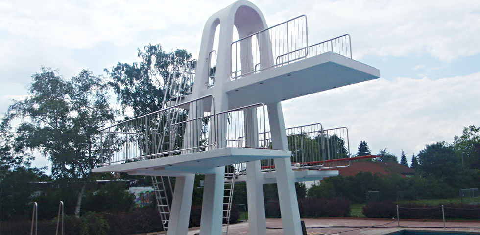 Um Form und Abmessungen des alten Sprungturms zu erhalten, werden die Kanten auf Schalungsschablone übertragen, die beim Spritzbetonauftrag als Lehren dienten. Schritt für Schritt näherte man sich mit Schalung und Spritzbetonauftrag der alten Form an. Bis auf 1,5 cm unterhalb der künftigen Oberfläche werden Betongemische der Körnung 0/8 mm mit spritzrauher Oberfläche aufgetragen. Die Wiederherstellung der eingeriebenen Oberfläche erfolgt mit Spritzmörtel der 0/4 mm Körnung.